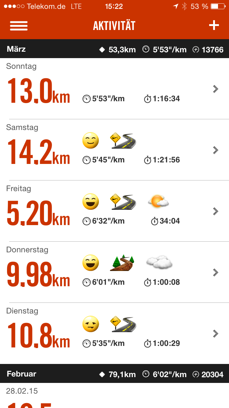 Ich bin die erste Woche knapp 54km gelaufen. War Di/Do/Fr/Sa/So draußen, da das Wetter cool war.